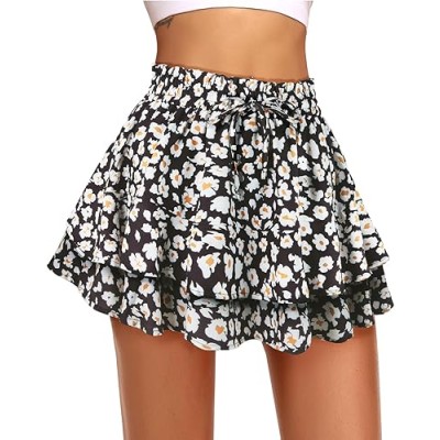 Women's Boho Ruffle Skirt Floral Tiered Mini Skirts with Shorts Underneath