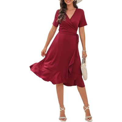 Women's Wrap dress V Neck Short Sleeve Ruffle Hem Midi Dress