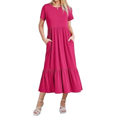 Women's Summer Maxi Dress 2024 Casual Short Sleeve Crewneck Flowy Swing Tiered Long Beach Dresses with Pockets
