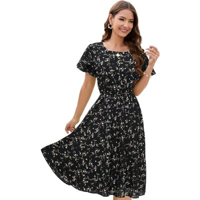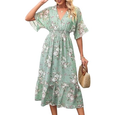 Women's Spring Summer 2024 Floral Midi Dress A Line Chiffon Boho Dress Casual Short Sleeve Long Beach Dress