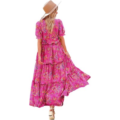 Women A Line Summer Dress V Neck Casual Loose Tiered Long Dresses with Pockets