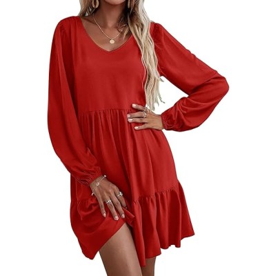 Women Casual Tunic Dress V Neck Tiered Dress Long Sleeve Fit Swing Shift Dress with Pockets Loose Ruffled Dresses