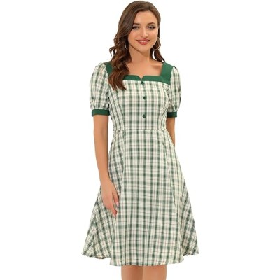 Women's Plaid Dress Square Neck Tie Back Contrast Short Sleeve A-line Dress