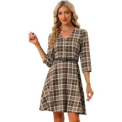 Women's V Neck 3/4 Sleeves Belted A-Line Plaid Dresses