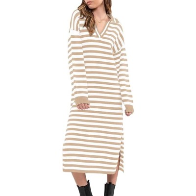 Women Long Sleeve Striped Color Block V Neck Casual Fall Dresses