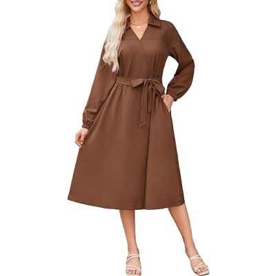 Womens Long Sleeve Wrap Dress Lapel V Neck Shirt Dress Casual A Line Midi Dress with Pockets Belt