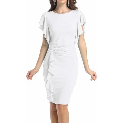 Womens Short Ruffle Sleeve Church Dress 50S Vintage Crew Neck Bodycon Work Pencil Midi Dress