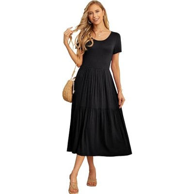 Women's Summer Casual Crewneck Short Sleeve Aline Tiered Flowy Maxi Dress with Pockets