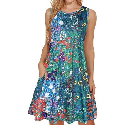 Women 2024 Casual Beach Sleeveless Floral Print Tank Loose Sundress with Pocket