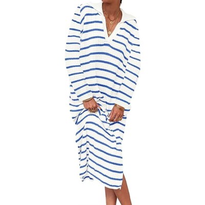 Womens Striped Sweater Dress Fall Chunky Knit V Neck Collared Long Sleeve Sexy Slit Loose Midi Dresses