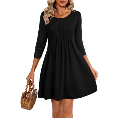 Women 2024 Fall 3/4 Sleeve Crew Neck Casual Tunic Swing Dress Knee Length Pleated Fitted T Shirt Dress