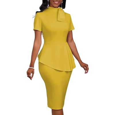 Women's Fashion Peplum Bodycon Short Sleeve Work Dresses Bow Club Ruffle Pencil Formal Cocktail Dress